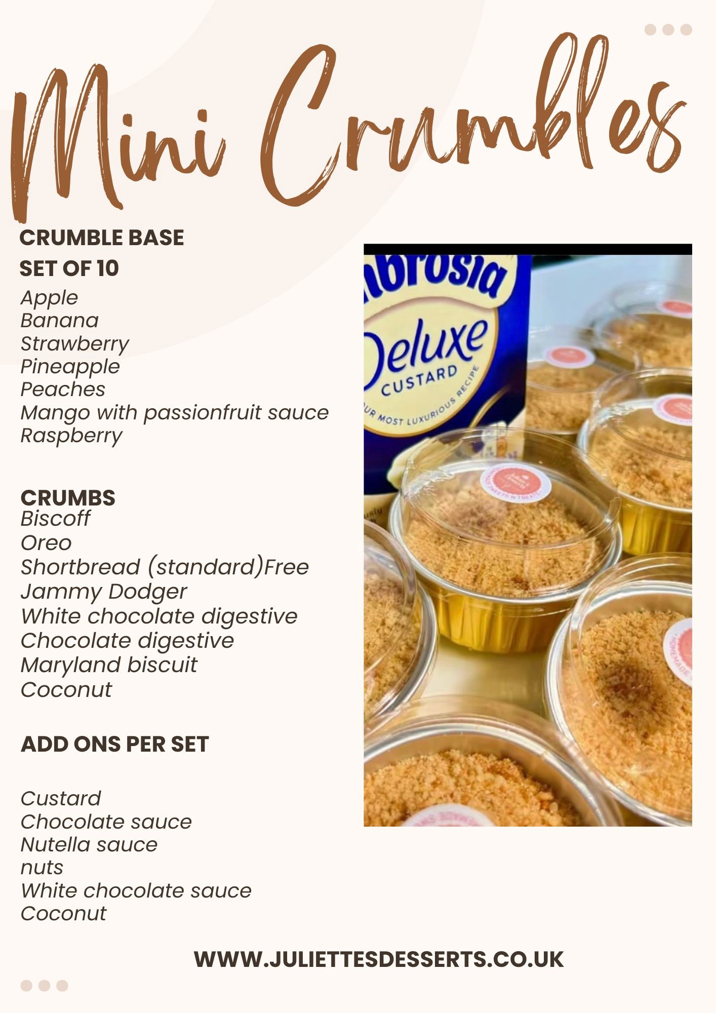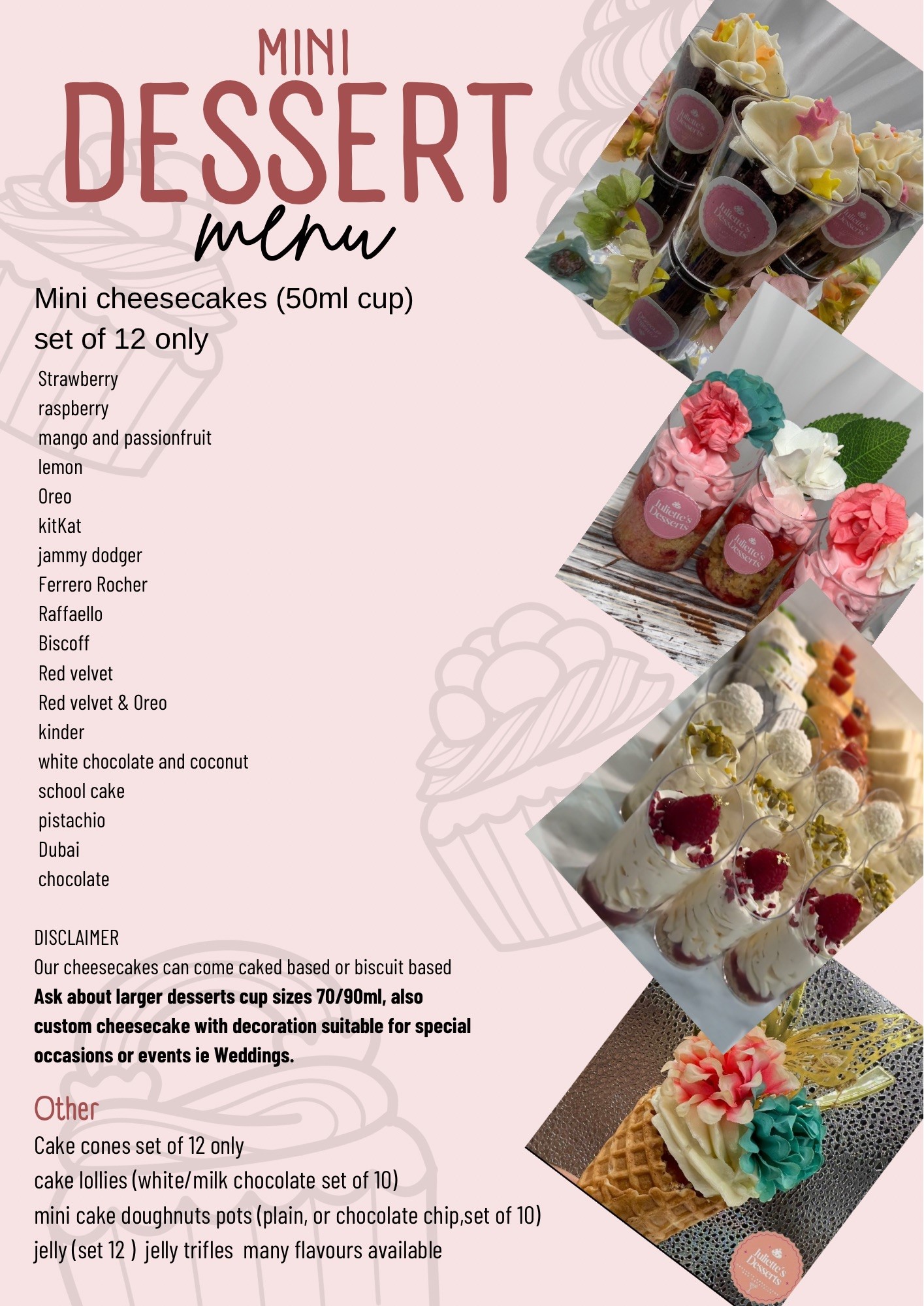 Welcome to Juliettes Desserts, where every bite tells a story. Explore our exquisite range of desserts, each crafted with passion and precision. We invite you to discover your new favourite treat.